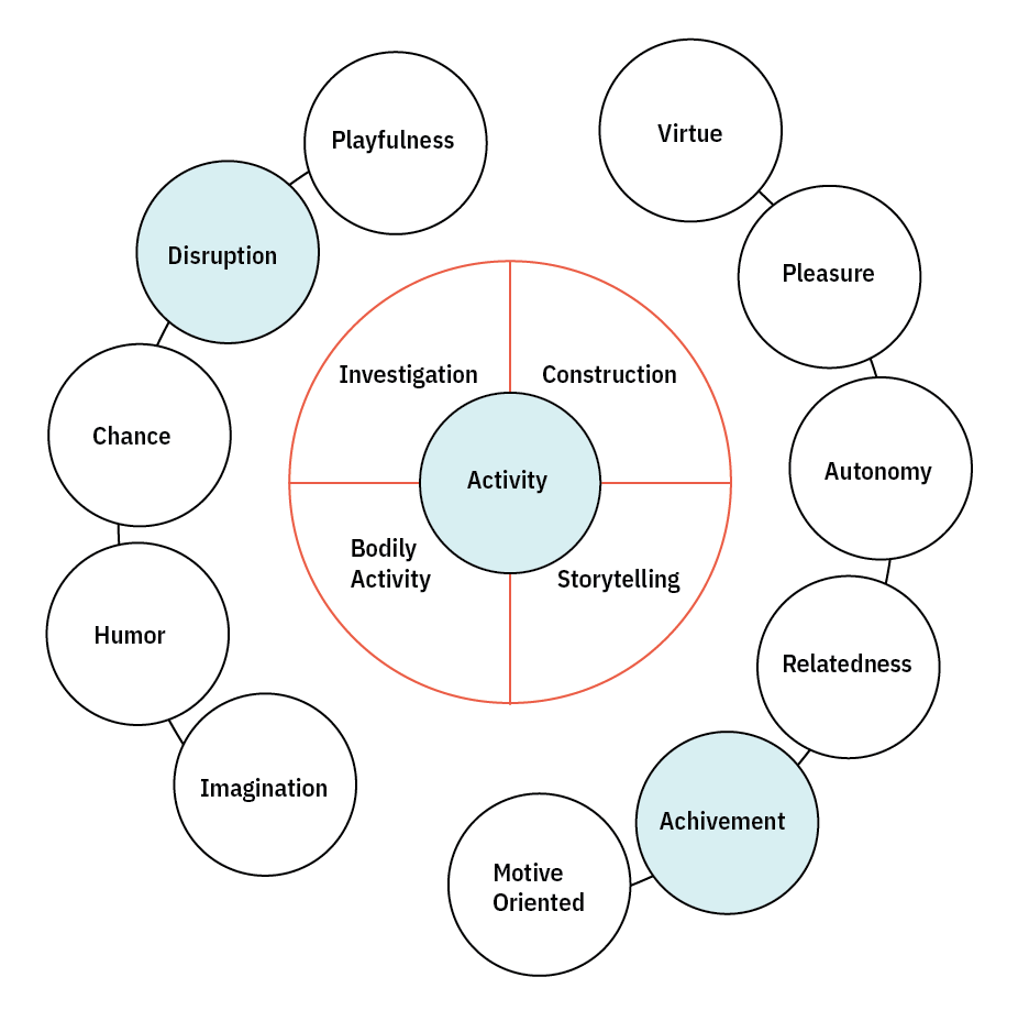Play resists definition but can be identified as an experience that is a complex set of chosen behaviors characterized by specific qualities which exist on a spectrum of free uncontrolled to, competitive, and controlled. As an act, it is complicated yet essential. Researcher Miguel Sicart writes, “Through play, we experience the world, we construct it, and we destroy it, and we explore who we are, and what we can say“ (2014, 5). He encourages people to consider play as an ecology. In this ecology, games are economically dominant, but they do not matter as much…they are a manifestation of a form of play. The ecology includes ritual, imaginative, body, object, rough, and dark play. These fall on a spectrum from free and uncontrolled to competitive and controlled. It is also essential to recognize that you can introduce playfulness to any activity, but it is not necessarily playing. Playfulness and play diverge because play is autotelic, an activity with its own purpose; we play because we want to play. Playfulness is an attitude and projection of characteristics into a situation/or situations; it is not autotelic. Another play researcher, Dr. Stuart Brown, recognized that not all enjoy play similarly. His research has cataloged a series of play personalities, from the joker to the kinesthetic, to the explorers, competitors, and storytellers.