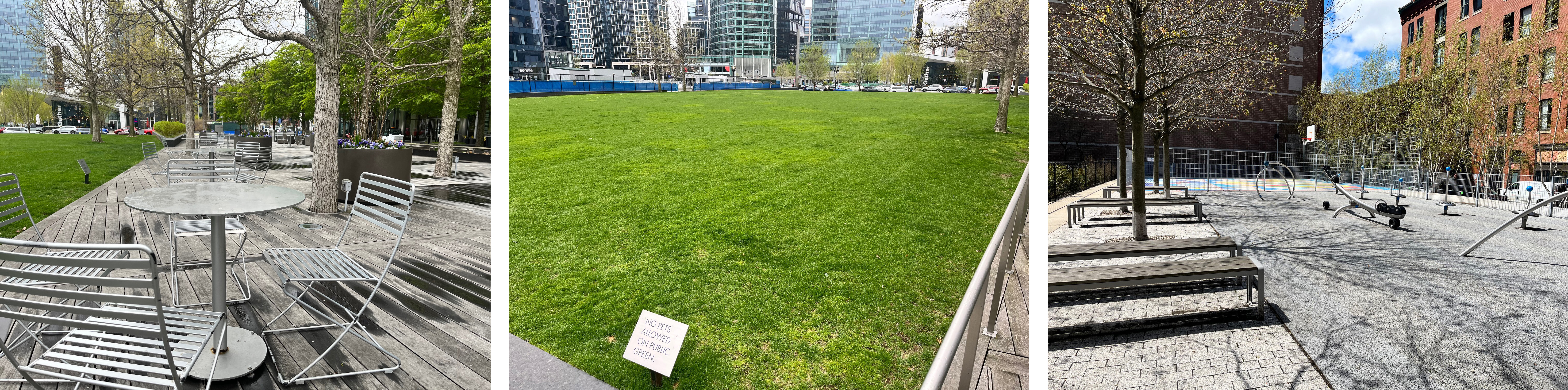 Figure 1: Potential Play Sites in the Seaport, Images by AuthorWhat does an infrastructure dedicated to play look like? On walks around the Seaport neighborhood, I see a few spaces for play and social interaction. The design firm Sasaki was tasked with creating the master plan (completion date t.b.d.), which includes primarily mixed-use business and residential environments with simple pedestrian green space. The few play spaces I have identified are a half-court for basketball next to a small playground for children and an open green for kinesthetic play. In addition, the ICA Museum places the Herman Miller Magis Spun Chair, which are top-like chairs that I often see children and adults happily playing with. There are also bike lanes and social spaces with movable seating. In its current state, only a few spaces have a clear and fixed purpose.